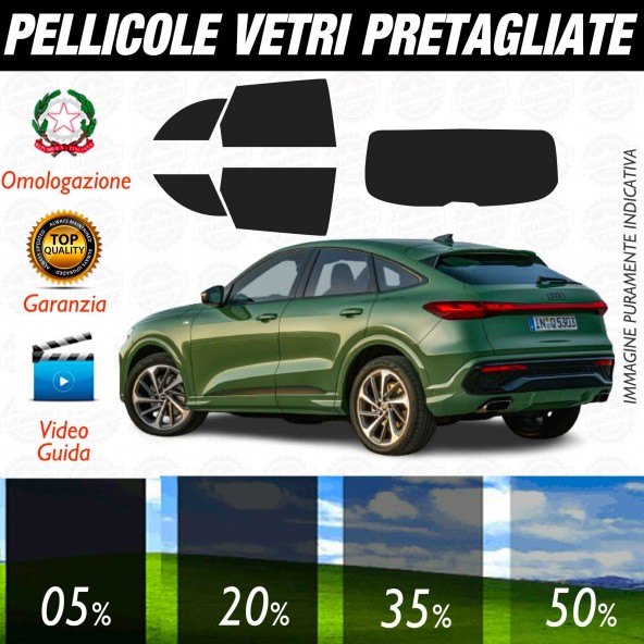 Pellicole oscuramento vetri auto posteriori pretagliate su misura per Audi Q5 Sportback (dal 2025 in poi). Facili da installare, garantiscono privacy, protezione dal sole e look sportivo.